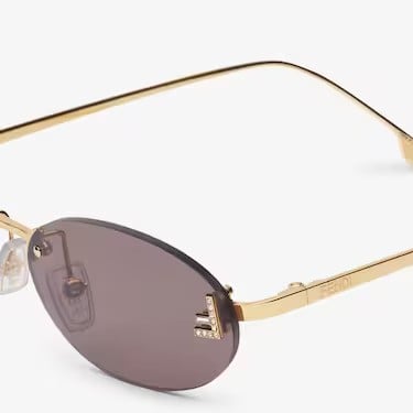 - نظارة Fendi First Crystal بيضاوية الشكل، ذات هيكل معدني ذهبي اللون بدون إطار. عدسات زرقاء مزينة بالكريستال بحرف F الصغير. وسادات أنف قابلة للتعديل.